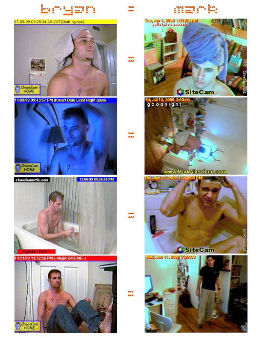 OK but seriously...A few weeks ago I ran across the site (ChaosInAustin.com) of a fellow webcammer named Bryan (or "Bry" as he sometimes goes by). Bryan's good looks and Texan-ish persona (what with my predisposition towards Texans - where I was born and raised) quickly made his live cam a regular on my desktop whenever I was at my computer. I soon learned he was watching me refularly as well. After a few weeks of shooting emails back and forth, Bryan and I found ourselves "flirting" with each other on a regular basis. We've never spoken on the phone or chatted, and our emailed conversations have been pretty delayed (one email left, responded to the next day, then back again, etc...etc...). We definitely are interested in each other, we just need some real quality time together to "really get to know one another". Why just look at some of these near-identical cam shots to see how much we have in common: