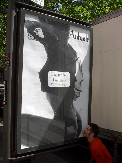 The ads in France on TV and in magazines and on the streets and billboards and stuff are like soft porn - for like paper towels and motor oil and stuff. It's hilarious. < >